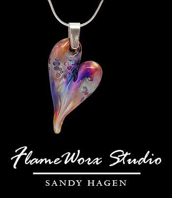 I have taken many glass workshops and classes from glass masters throughout the years. Recently I have found a new glass (borosilicate) to create my glass pendants and hearts. The pendants look like miniature paperweights and my hearts have a watercolor effect in the glass.